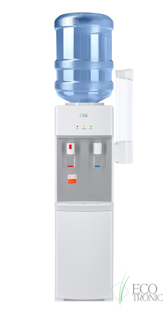 Напольный кулер с электронным охлаждением стандартного (от 90 до 105см) типоразмера. Краны «нажим кружкой», защита от случайного нажатия на кране горячей воды. Корпус белого цвета с акцентной серой вставкой в области подачи воды. Возможность жесткого крепления к полу для защиты от падения. Индикаторы нагрева и охлаждения в верхней части передней панели.